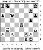 can you see how ? (answer : Nc7+ forking King and Rook 2.Kb3 b5 3.Qf2 Kd7 4.Qc5 Re6 5.Qc7+ Ke8 |